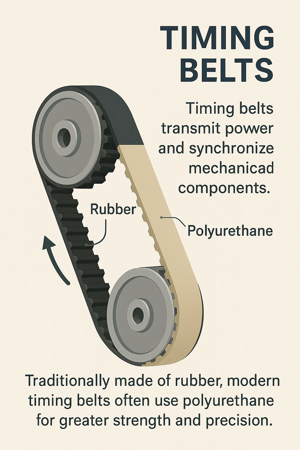 正时皮带是各种机械系统中的关键部件,从汽车发动机到工厂车间的复杂机器人。它们的主要功能是传输动力并同步两个或多个轴的旋转,确保机械部件完美和谐地移动。这种精度对于机械的高效可靠运行至关重要。虽然同步带的基本用途保持不变,但用于制造同步带的材料已经不断发展,以满足现代应用多样化和苛刻的要求。从历史上看,橡胶因其出色的灵活性和成本效益而一直是同步带的首选材料。然而,自动化、机器人技术和高精度机械的兴起导致聚氨酯的使用增加,聚氨酯是一种以其卓越的强度和精度而闻名的合成聚合物。
